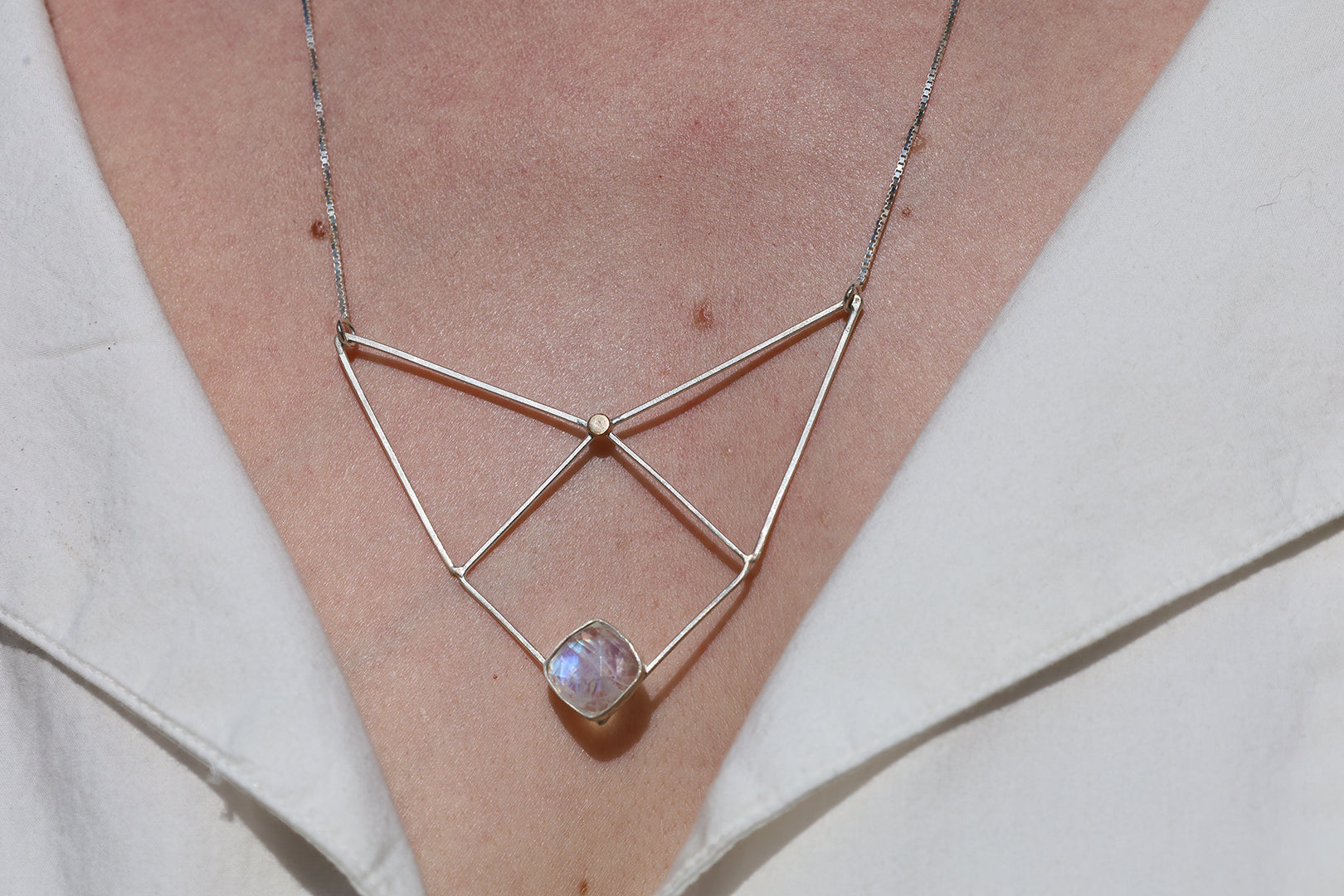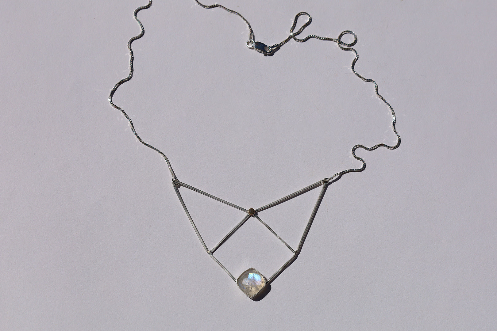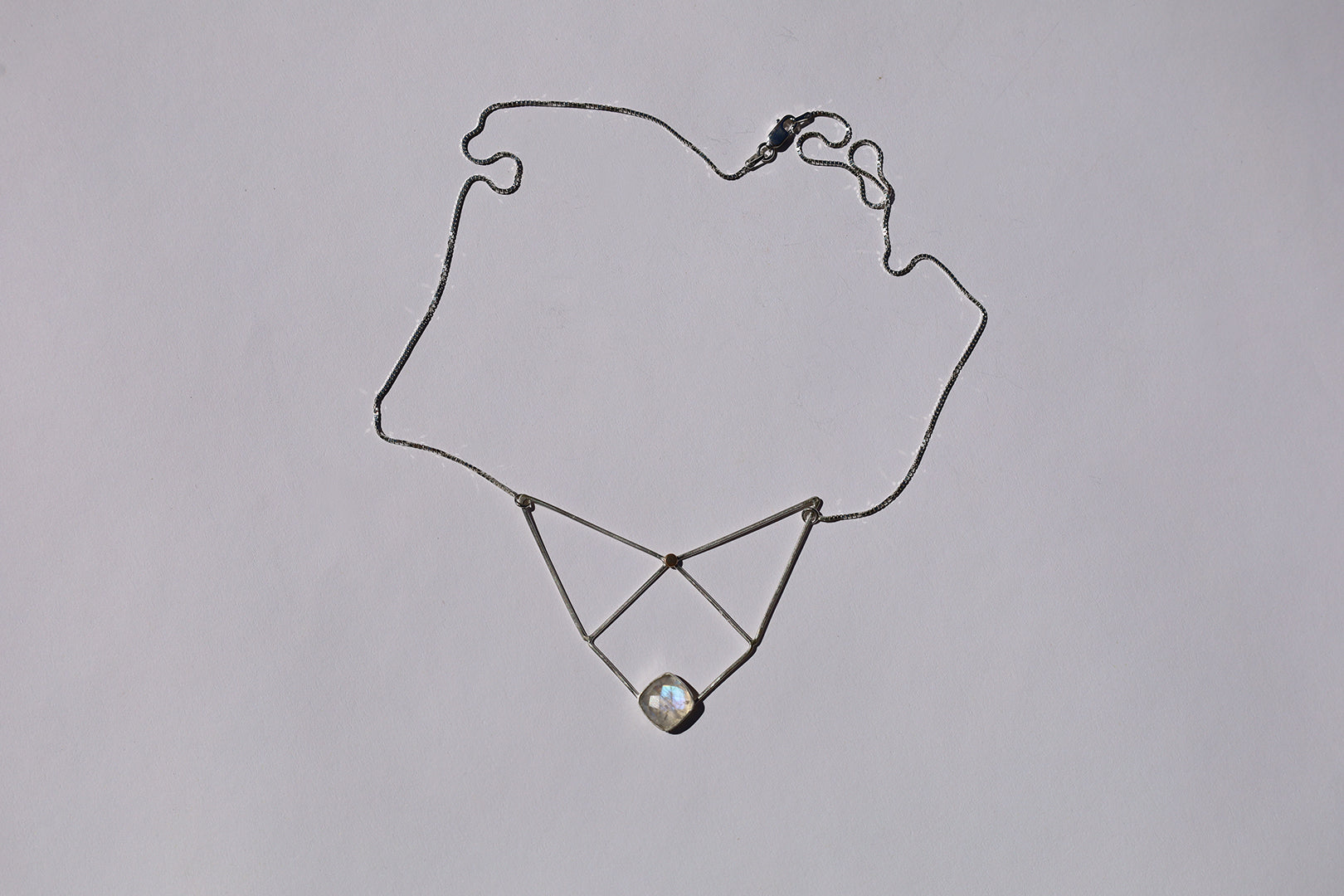 Sterling silver necklace set with rose cut rainbow moonstone; hangs on 18" chain.