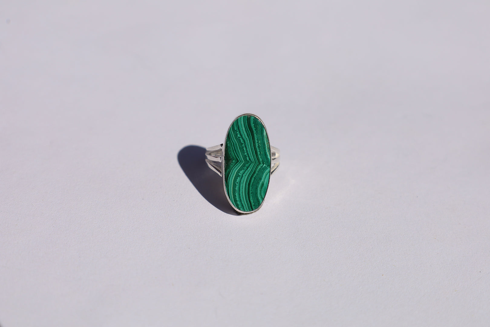 Sterling sterling split shank ring set with malachite, size 6.