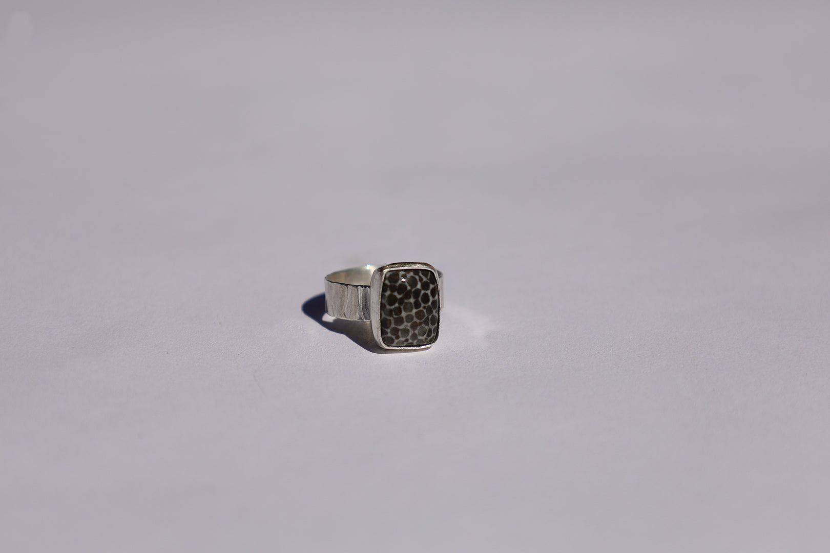 Sterling silver ring set with black fossil coral, size 5.