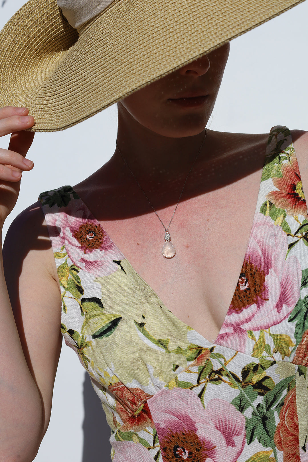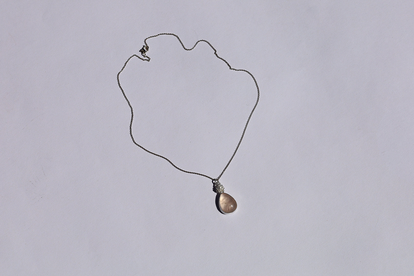 Sterling silver necklace set with rose quartz; hangs on 18" chain.