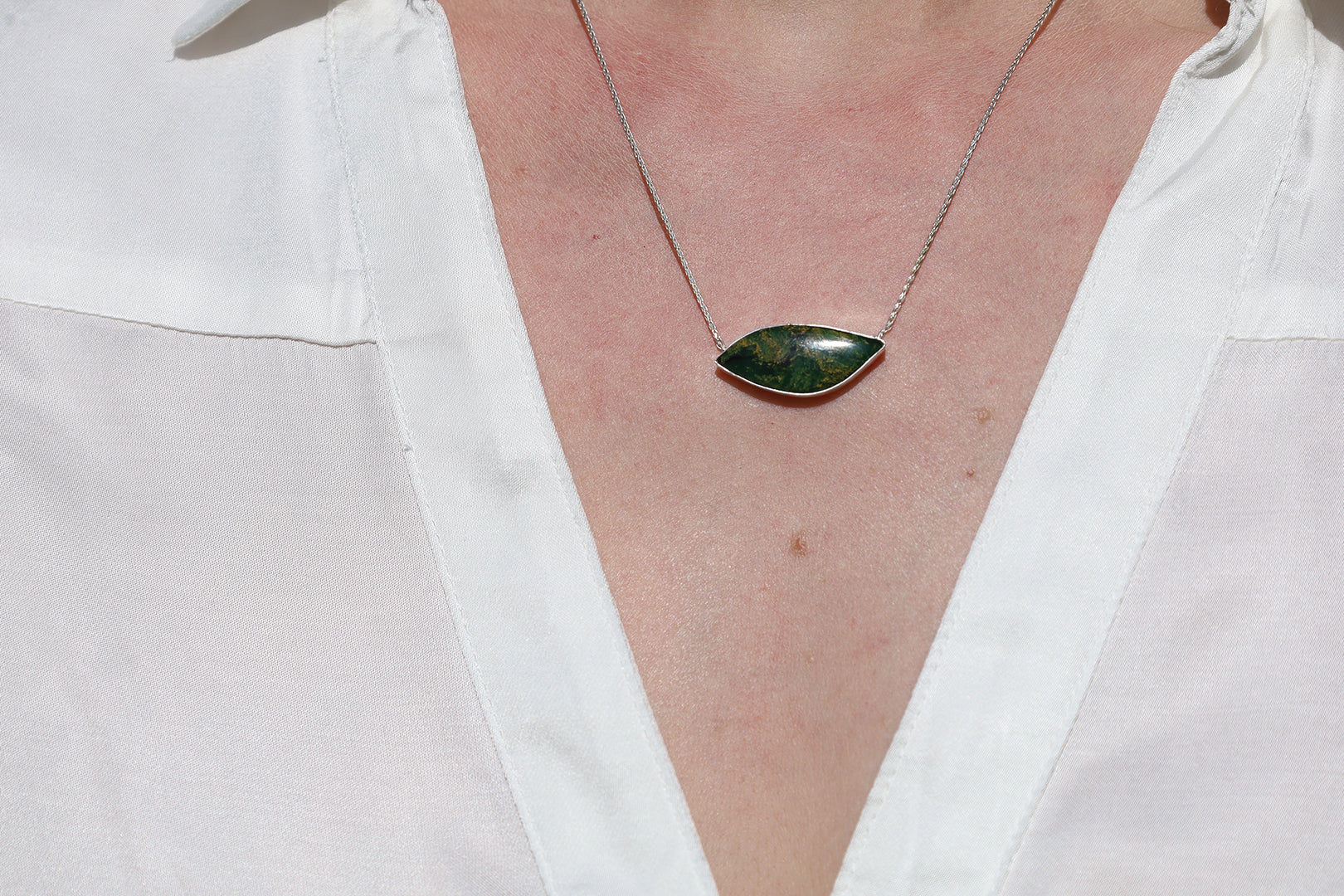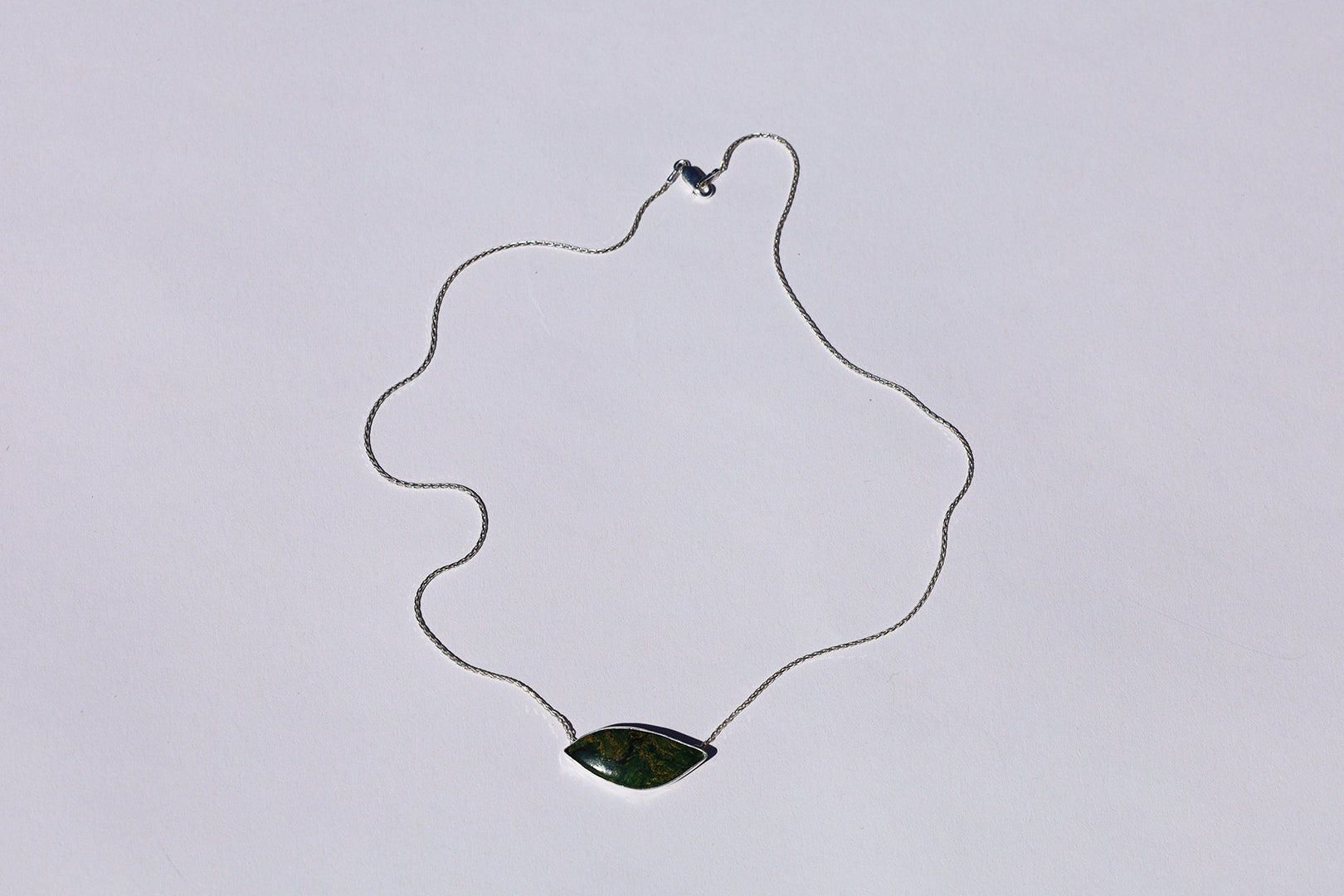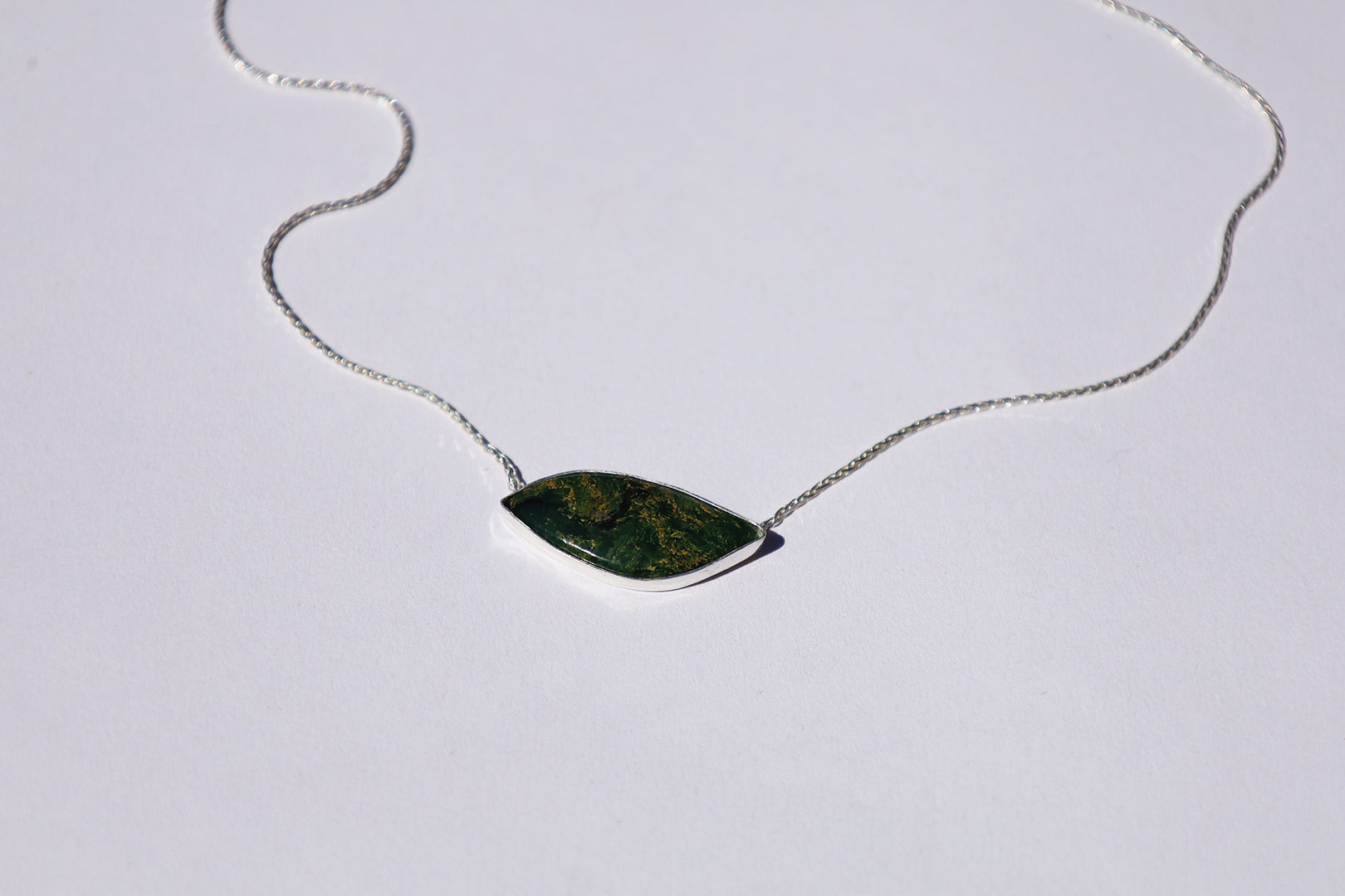 Sterling silver necklace set with fuschite; hangs on 16" chain.