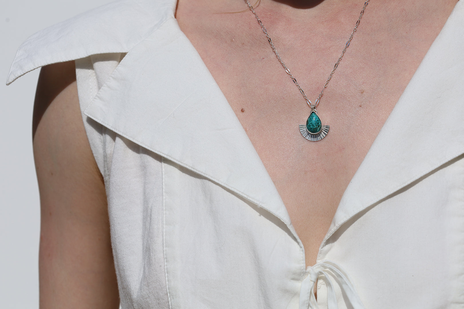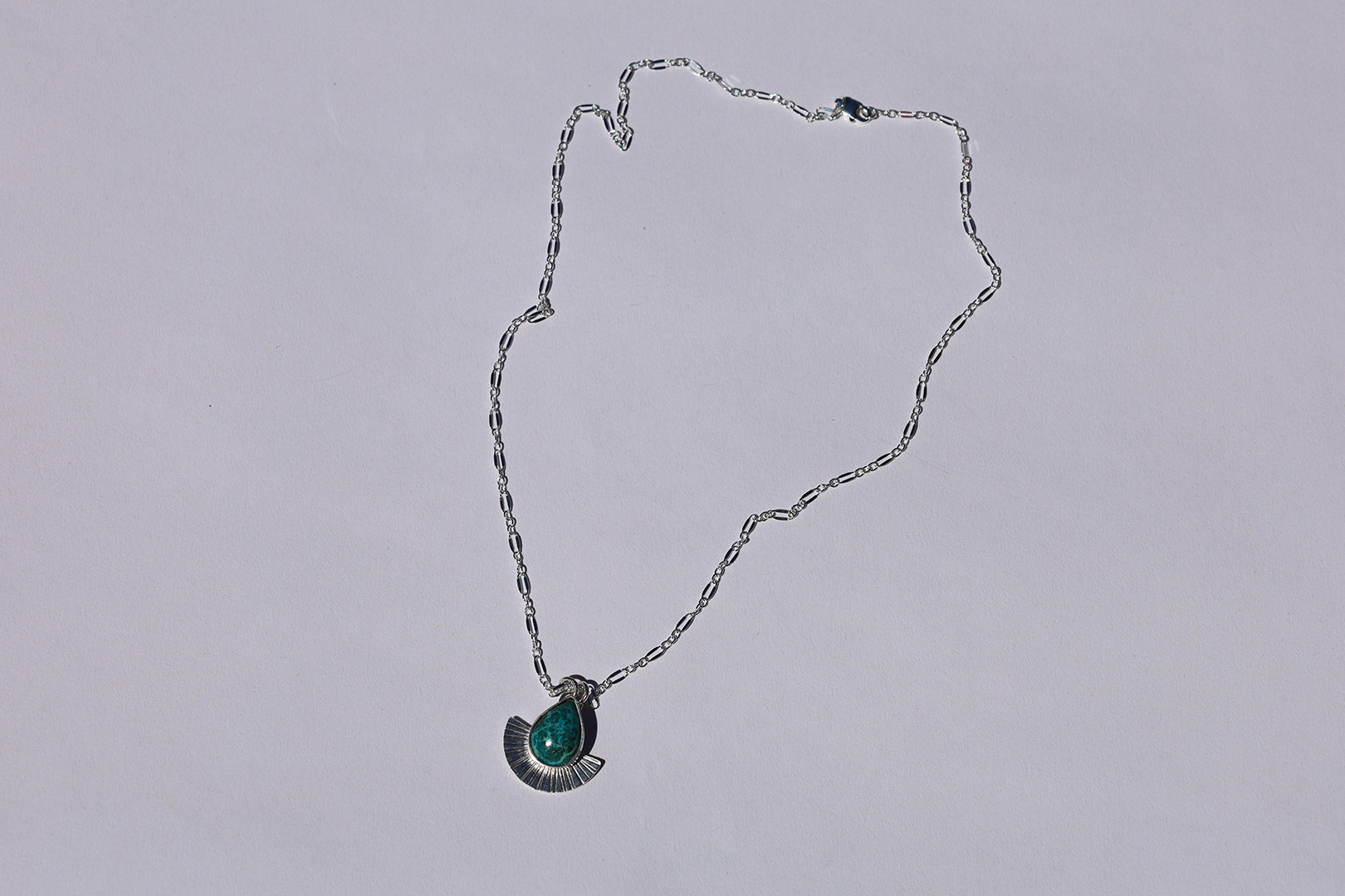 Sterling silver necklace set with chrysocolla; hangs on 18" chain.