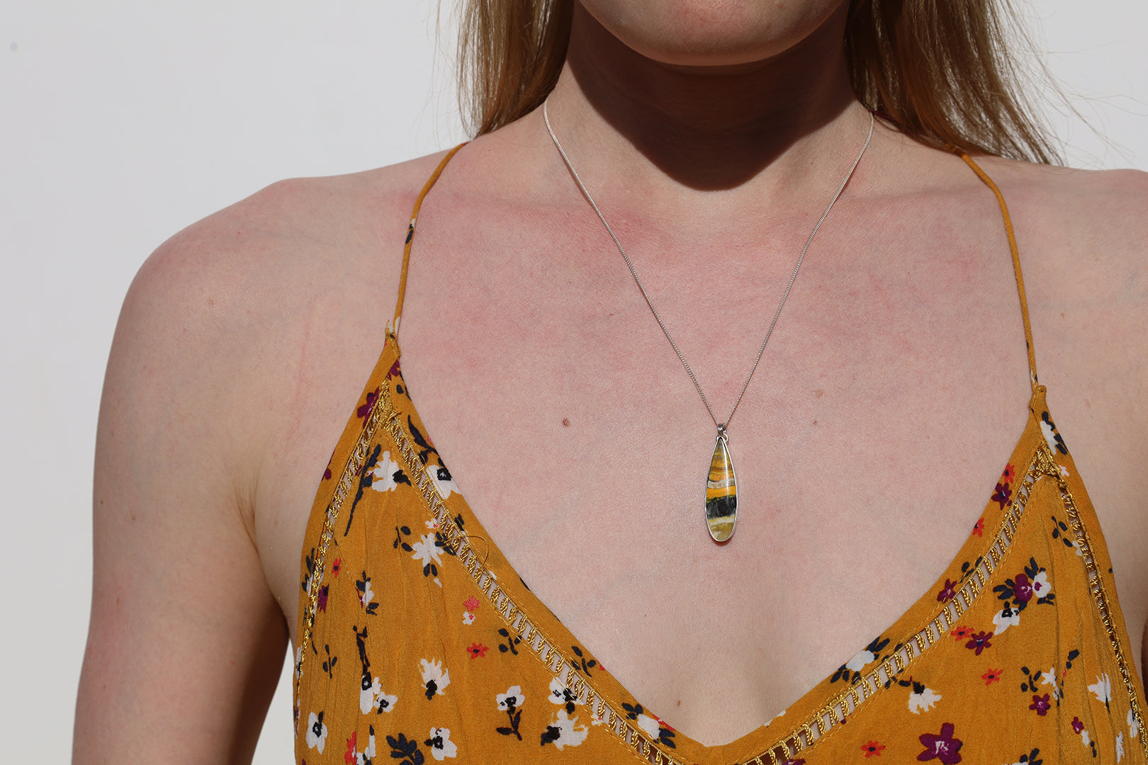 Sterling silver necklace with an open bezel set with bumble bee jasper; hangs on 18" chain.