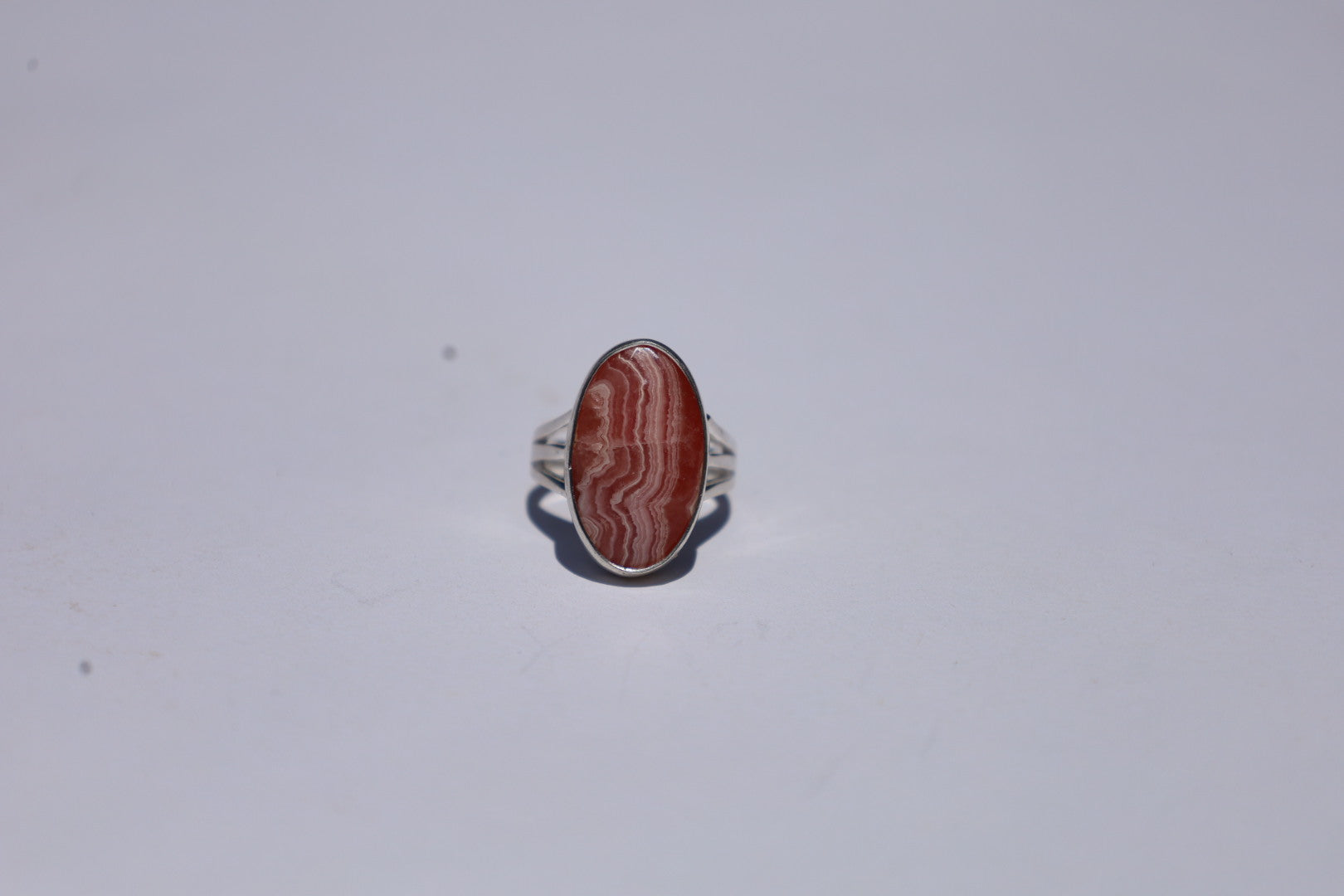 Sterling silver split shank ring set with rhodochrosite (Argentina), size 6.
