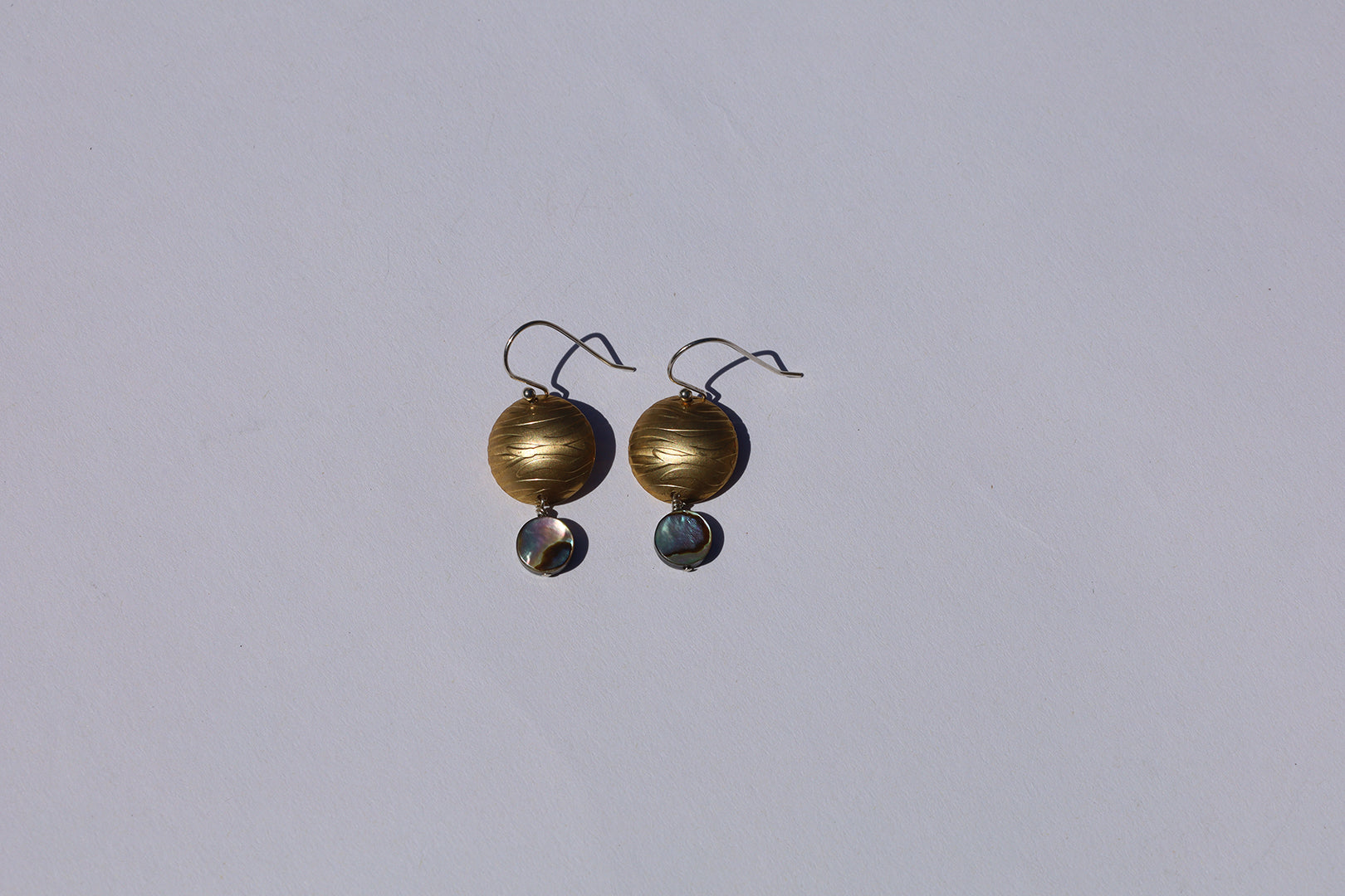 Textured brass earrings with abalone. Hangs on sterling silver ear wire.