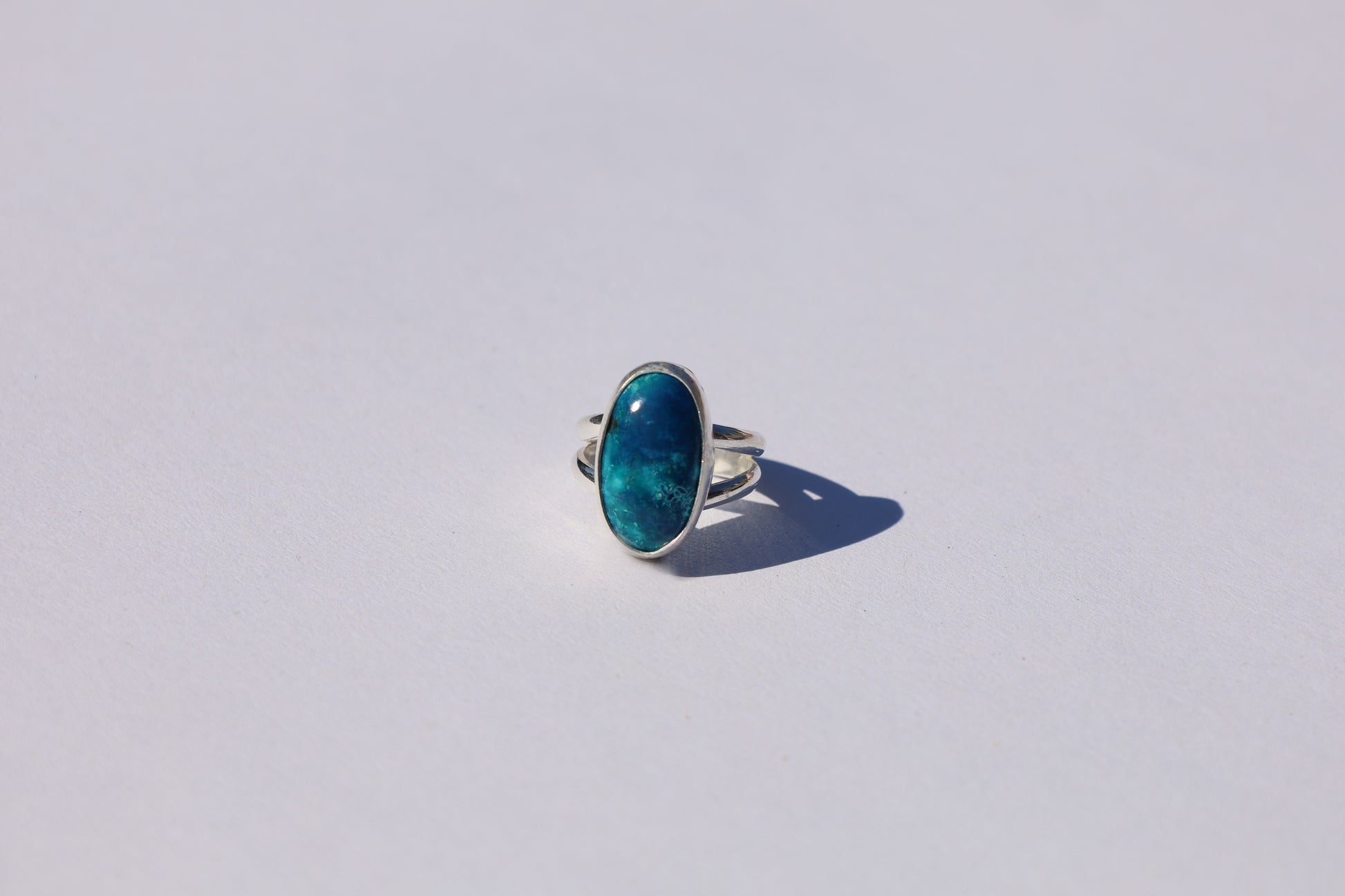 Sterling silver split shank ring set with Azurite Chrysocolla, size 6.75