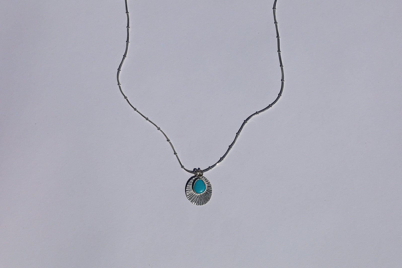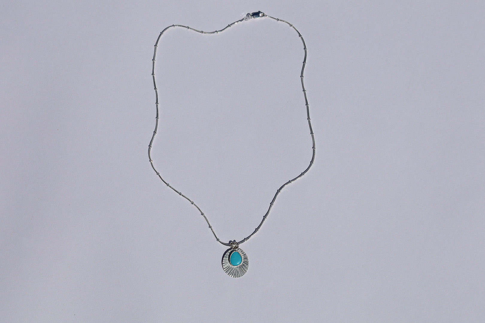Sterling silver necklace set with Kingman turquoise, hangs on 16" chain.