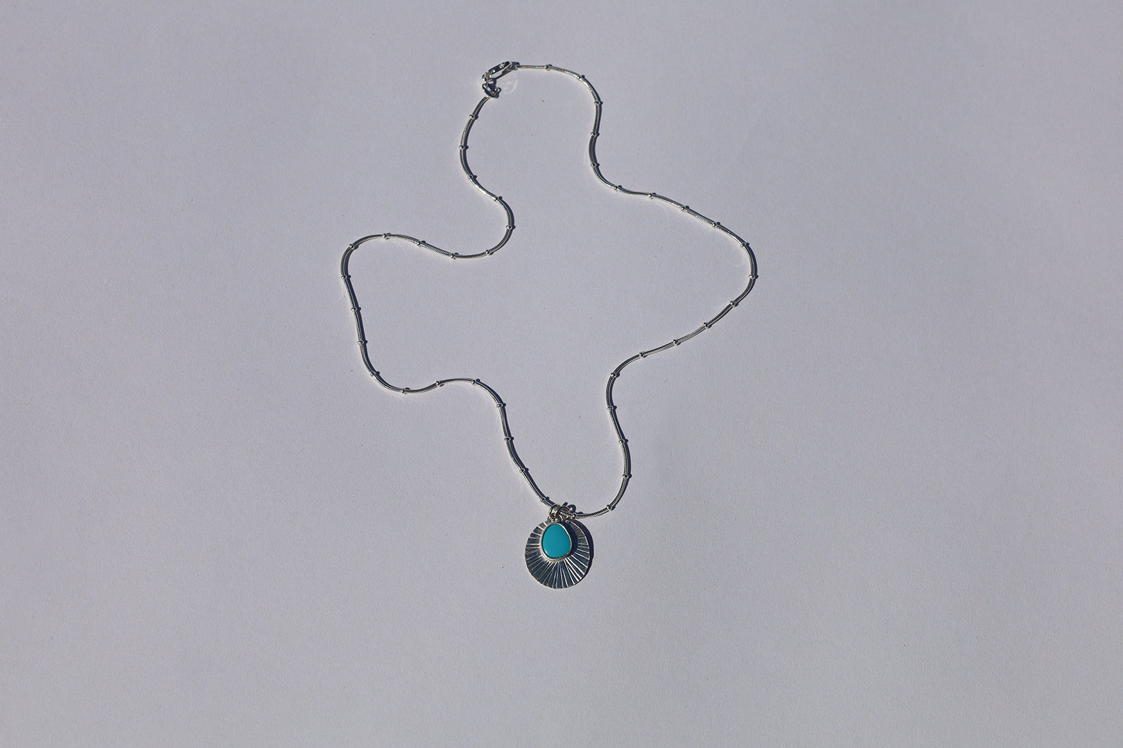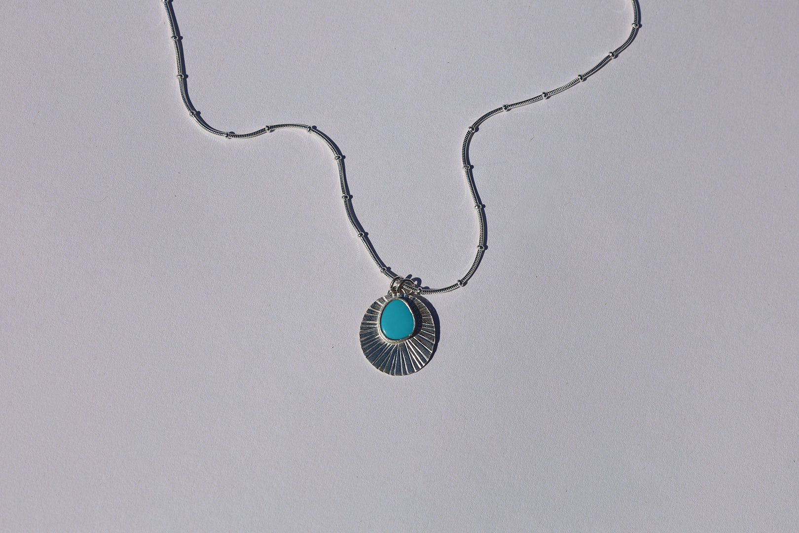 Sterling silver starburst necklace set with Kingman turquoise; hangs on 18" chain.