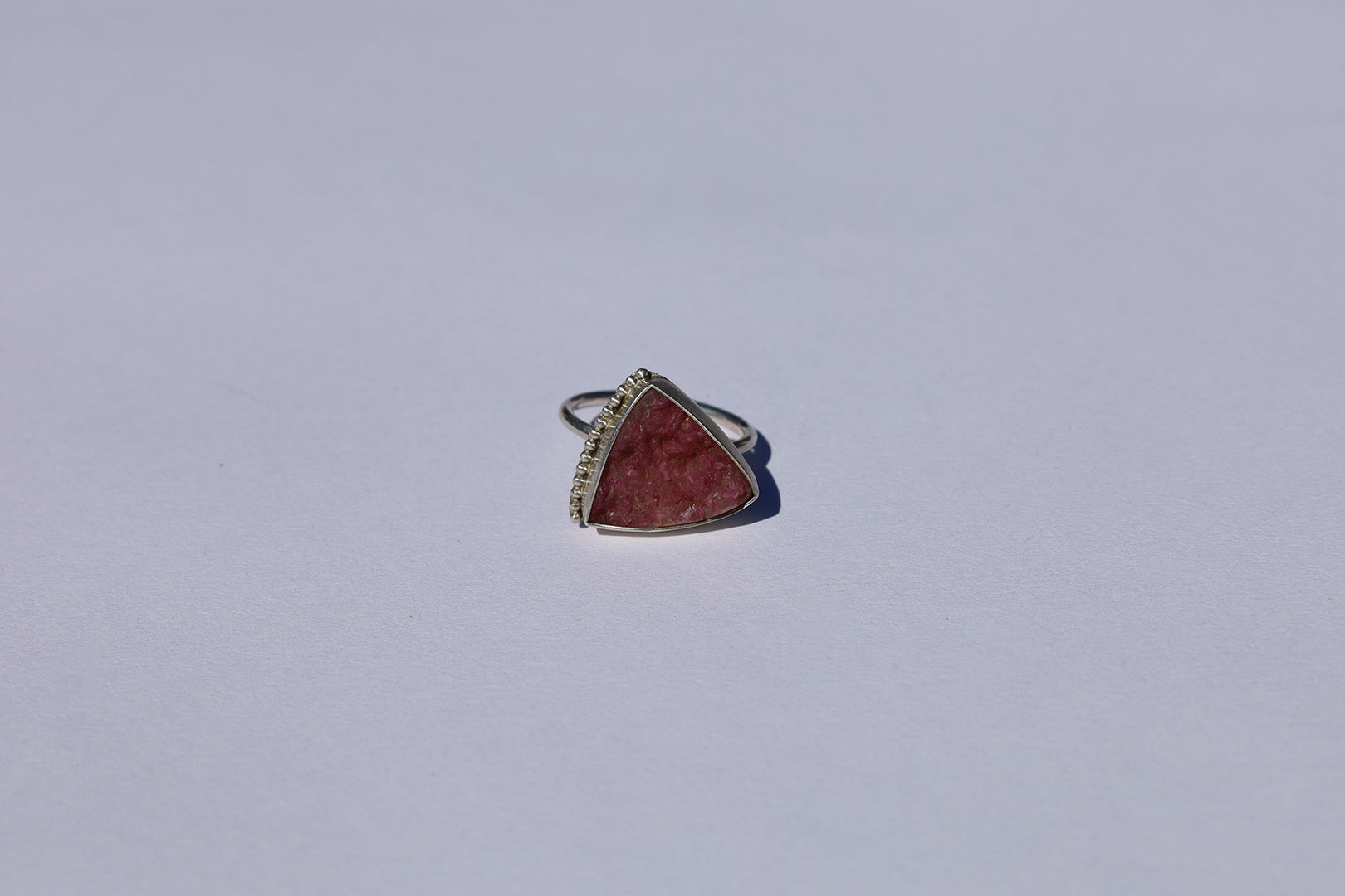 Sterling silver beaded ring set with a triangular pink druzy; size 7.